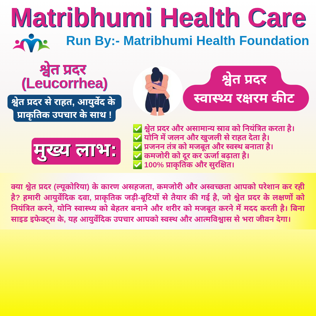 क्या श्वेत प्रदर (ल्यूकोरिया) के कारण असहजता, कमजोरी और अस्वच्छता आपको परेशान कर रही है? हमारी आयुर्वेदिक दवा, प्राकृतिक जड़ी-बूटियों से तैयार की गई है, जो श्वेत प्रदर के लक्षणों को नियंत्रित करने, योनि स्वास्थ्य को बेहतर बनाने और शरीर को मजबूत करने में मदद करती है। बिना साइड इफेक्ट्स के, यह आयुर्वेदिक उपचार आपको स्वस्थ और आत्मविश्वास से भरा जीवन देगा।