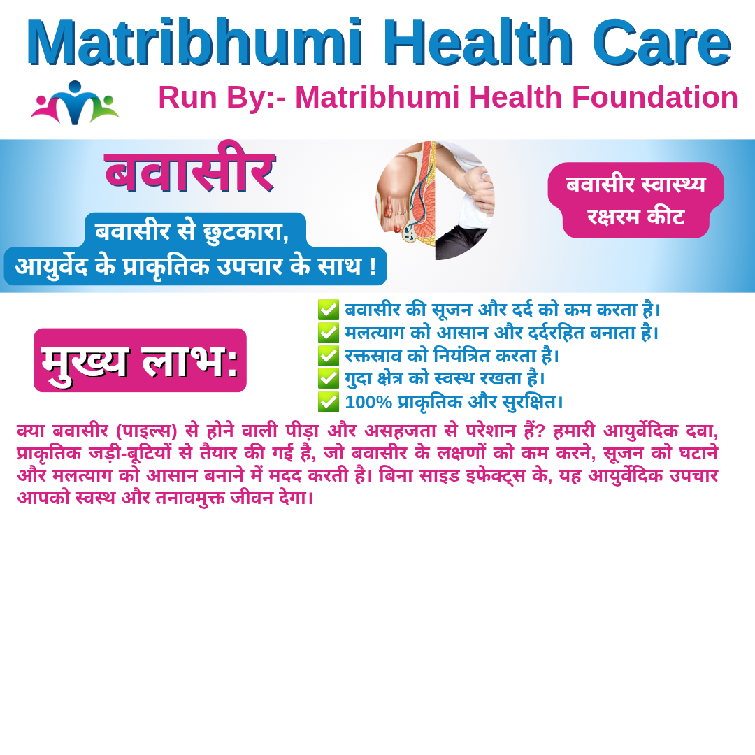 क्या गुदा की पथरी (Anal Fissure) के कारण दर्द, जलन और असहजता आपको परेशान कर रही है? हमारी आयुर्वेदिक दवा, प्राकृतिक जड़ी-बूटियों से तैयार की गई है, जो गुदा क्षेत्र के दर्द को कम करने, घाव को भरने और मलत्याग को आसान बनाने में मदद करती है। बिना साइड इफेक्ट्स के, यह आयुर्वेदिक उपचार आपको स्वस्थ और आरामदायक जीवन देगा। मुख्य लाभ: ✅ गुदा की पथरी के दर्द और जलन को कम करता है। ✅ घाव को प्राकृतिक रूप से ठीक करता है। ✅ मलत्याग को दर्दरहित और आसान बनाता है। ✅ कब्ज से राहत देता है। ✅ 100% प्राकृतिक और सुरक्षित।