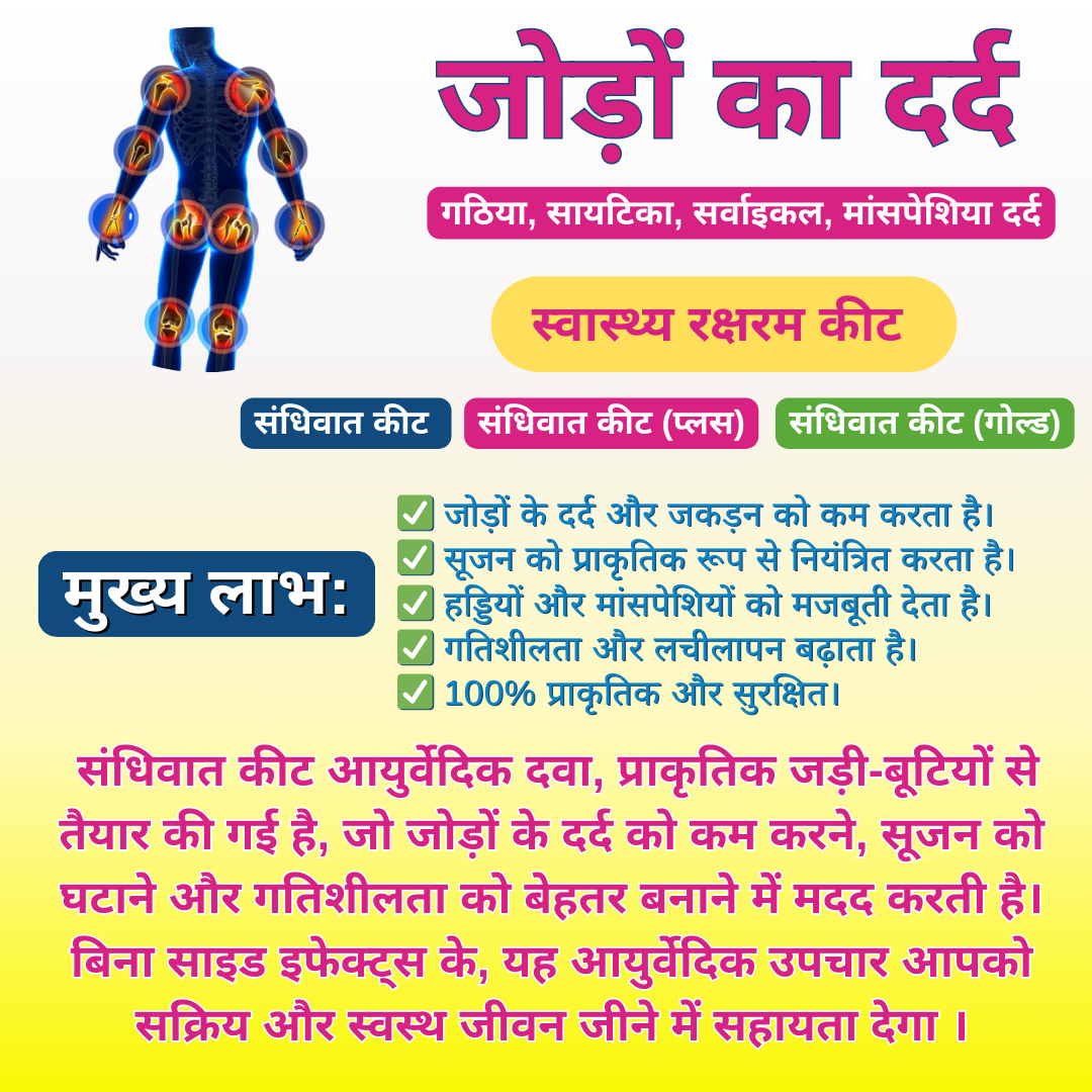 क्या संधिवात (Arthritis) के कारण जोड़ों का दर्द और जकड़न आपको परेशान कर रहा है? हमारी आयुर्वेदिक दवा, प्राकृतिक जड़ी-बूटियों से तैयार की गई है, जो जोड़ों के दर्द को कम करने, सूजन को घटाने और गतिशीलता को बेहतर बनाने में मदद करती है। बिना साइड इफेक्ट्स के, यह आयुर्वेदिक उपचार आपको सक्रिय और स्वस्थ जीवन जीने में सहायता देगा।मुख्य लाभ: ✅ जोड़ों के दर्द और जकड़न को कम करता है। ✅ सूजन को प्राकृतिक रूप से नियंत्रित करता है। ✅ हड्डियों और मांसपेशियों को मजबूती देता है। ✅ गतिशीलता और लचीलापन बढ़ाता है। ✅ 100% प्राकृतिक और सुरक्षित।