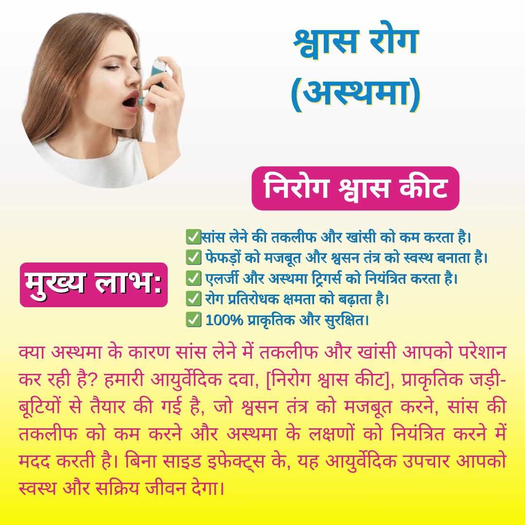 क्या अस्थमा के कारण सांस लेने में तकलीफ और खांसी आपको परेशान कर रही है? हमारी आयुर्वेदिक दवा, प्राकृतिक जड़ी-बूटियों से तैयार की गई है, जो श्वसन तंत्र को मजबूत करने, सांस की तकलीफ को कम करने और अस्थमा के लक्षणों को नियंत्रित करने में मदद करती है। बिना साइड इफेक्ट्स के, यह आयुर्वेदिक उपचार आपको स्वस्थ और सक्रिय जीवन देगा। मुख्य लाभ: ✅ सांस लेने की तकलीफ और खांसी को कम करता है। ✅ फेफड़ों को मजबूत और श्वसन तंत्र को स्वस्थ बनाता है। ✅ एलर्जी और अस्थमा ट्रिगर्स को नियंत्रित करता है। ✅ रोग प्रतिरोधक क्षमता को बढ़ाता है। ✅ 100% प्राकृतिक और सुरक्षित।
