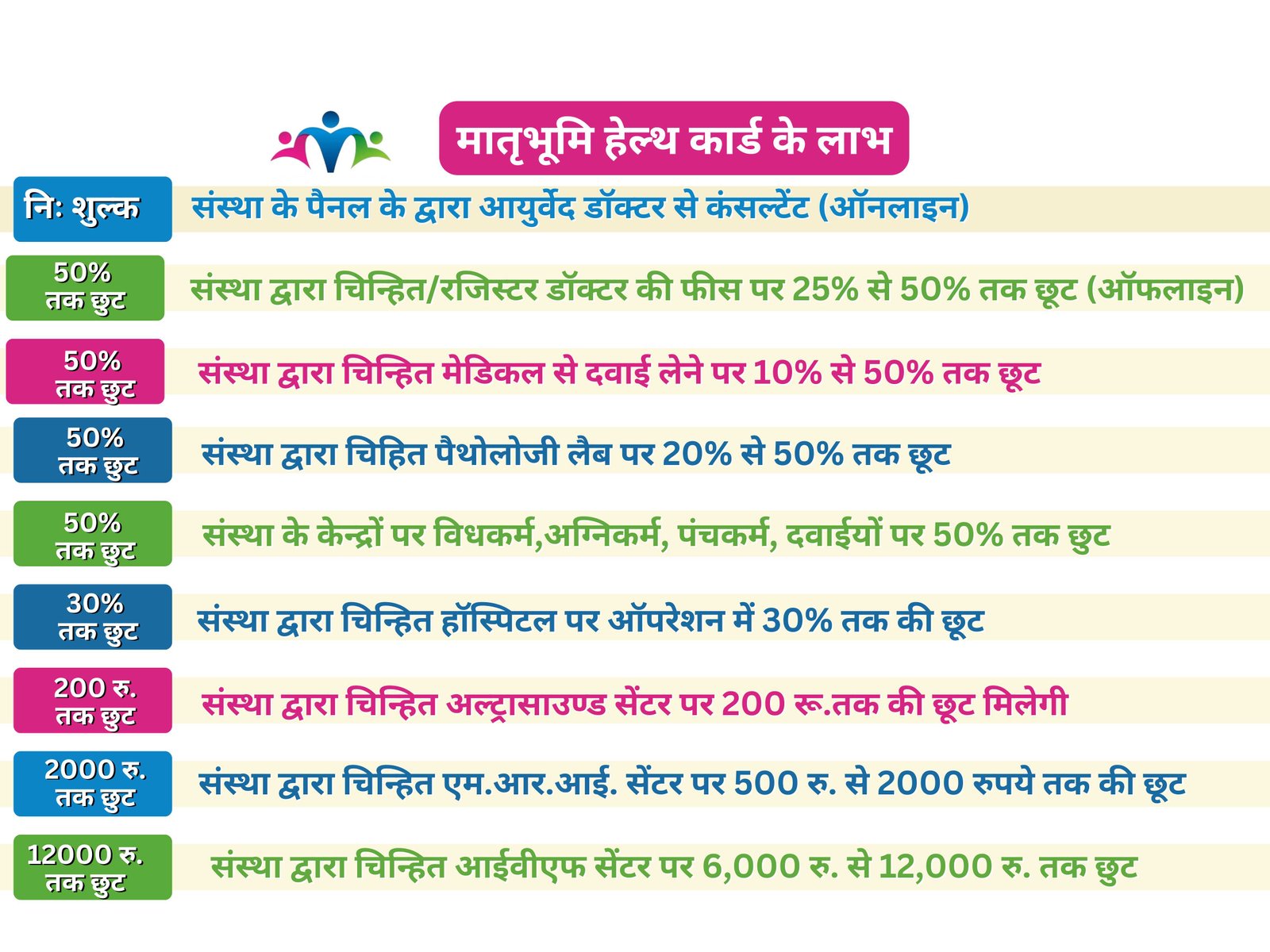 मातृभूमि हेल्थ फाउंडेशन  संस्था की ओर से  आप सभी का हार्दिक अभिनंदन करता हूँ। हमारा उद्देश्य भारत के प्रत्येक नागरिक तक किफायती, सुलभ और गुणवत्तापूर्ण स्वास्थ्य सेवाएं पहुँचाना है, विशेष रूप से उन लोगों तक जो आर्थिक रूप से कमजोर हैं या ग्रामीण क्षेत्रों में रहते हैं। मातृभूमि हेल्थ कार्ड योजना इसी दिशा में एक महत्वपूर्ण कदम है।इस योजना के तहत हमने विभिन्न स्वास्थ्य सेवाओं पर छूट और मुफ्त सुविधाओं की व्यवस्था की है, ताकि आपका स्वास्थ्य और आपके परिवार का भविष्य सुरक्षित रहे। मातृभूमि हेल्थ कार्ड के प्रमुख लाभों में शामिल हैं।