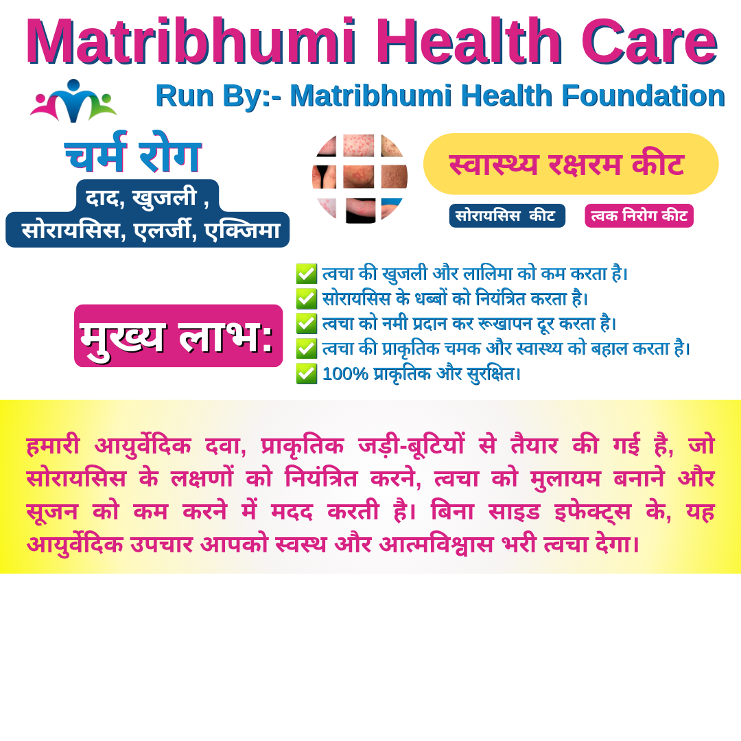 क्या सोरायसिस के कारण त्वचा की खुजली, लालिमा और रूखापन आपको परेशान कर रहा है? हमारी आयुर्वेदिक दवा, प्रकृतिक जड़ी-बूटियों से तैयार की गई है, जो सोरायसिस के लक्षणों को नियंत्रित करने, त्वचा को मुलायम बनाने और सूजन को कम करने में मदद करती है। बिना साइड इफेक्ट्स के, यह आयुर्वेदिक उपचार आपको स्वस्थ और आत्मविश्वास भरी त्वचा देगा।