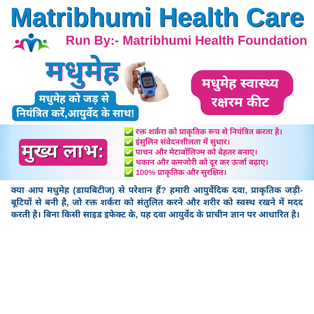 मातृभूमि हेल्थ फाउंडेशन  संस्था की ओर से  आप सभी का हार्दिक अभिनंदन करता हूँ। हमारा उद्देश्य भारत के प्रत्येक नागरिक तक किफायती, सुलभ और गुणवत्तापूर्ण स्वास्थ्य सेवाएं पहुँचाना है, विशेष रूप से उन लोगों तक जो आर्थिक रूप से कमजोर हैं या ग्रामीण क्षेत्रों में रहते हैं। मातृभूमि हेल्थ कार्ड योजना इसी दिशा में एक महत्वपूर्ण कदम है।इस योजना के तहत हमने विभिन्न स्वास्थ्य सेवाओं पर छूट और मुफ्त सुविधाओं की व्यवस्था की है, ताकि आपका स्वास्थ्य और आपके परिवार का भविष्य सुरक्षित रहे। मातृभूमि हेल्थ कार्ड के प्रमुख लाभों में शामिल हैं।