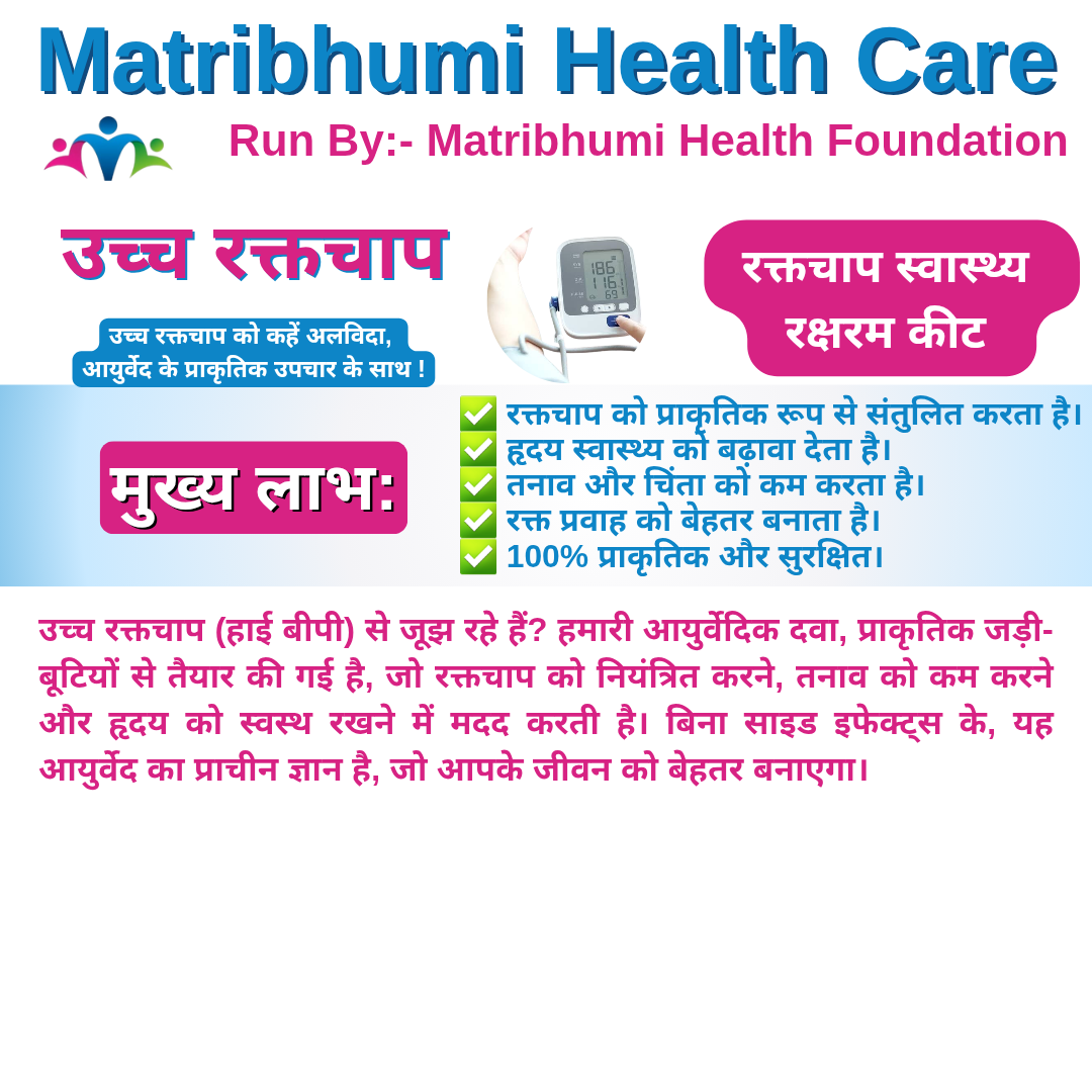 उच्च रक्तचाप (हाई बीपी) से जूझ रहे हैं? हमारी आयुर्वेदिक दवा, प्राकृतिक जड़ी-बूटियों से तैयार की गई है, जो रक्तचाप को नियंत्रित करने, तनाव को कम करने और हृदय को स्वस्थ रखने में मदद करती है। बिना साइड इफेक्ट्स के, यह आयुर्वेद का प्राचीन ज्ञान है, जो आपके जीवन को बेहतर बनाएगा। मुख्य लाभ: ✅ रक्तचाप को प्राकृतिक रूप से संतुलित करता है। ✅ तनाव और चिंता को कम करता है। ✅ हृदय स्वास्थ्य को बढ़ावा देता है। ✅ रक्त प्रवाह को बेहतर बनाता है। ✅ 100% प्राकृतिक और सुरक्षित।