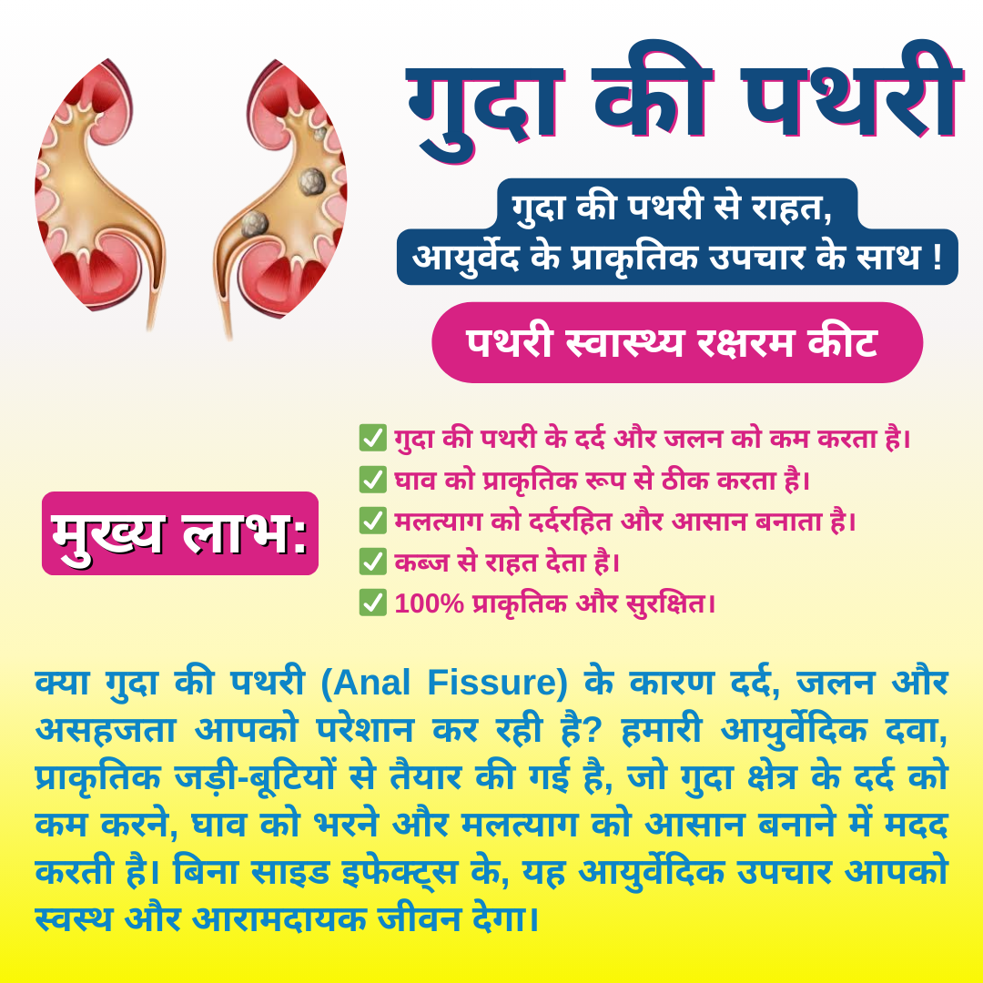 क्या गुदा की पथरी (Anal Fissure) के कारण दर्द, जलन और असहजता आपको परेशान कर रही है? हमारी आयुर्वेदिक दवा, प्राकृतिक जड़ी-बूटियों से तैयार की गई है, जो गुदा क्षेत्र के दर्द को कम करने, घाव को भरने और मलत्याग को आसान बनाने में मदद करती है। बिना साइड इफेक्ट्स के, यह आयुर्वेदिक उपचार आपको स्वस्थ और आरामदायक जीवन देगा। मुख्य लाभ: ✅ गुदा की पथरी के दर्द और जलन को कम करता है। ✅ घाव को प्राकृतिक रूप से ठीक करता है। ✅ मलत्याग को दर्दरहित और आसान बनाता है। ✅ कब्ज से राहत देता है। ✅ 100% प्राकृतिक और सुरक्षित।